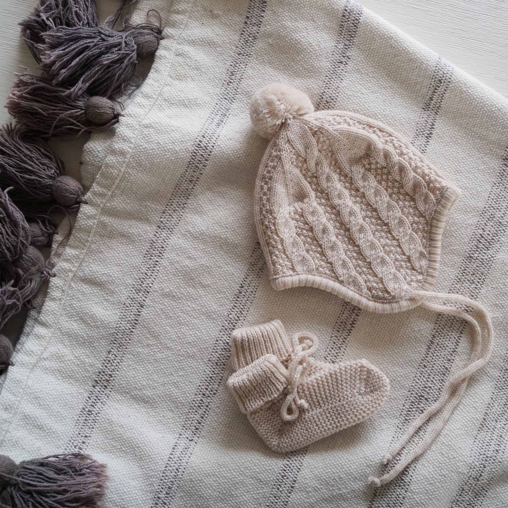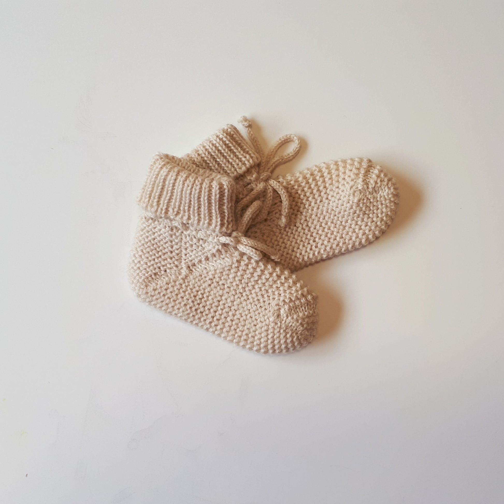 Put the finishing touch on your baby's outfit with these snugly booties. Made from soft merino wool, these knitted booties feature an ankle tie to keep them on wriggly baby feet. A beautiful new baby gift.
